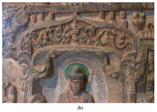 Figure 3b), and there is a high possibility of a connection between them. Of course, this example also contains some differences from the example of the lotus-born figure holding vines on the arch of Mogao Grottoes in terms of its placement, the attire of the lotus-born figure at the center, and the elements in vine units on both sides. These differences should result from the practical adaptation of the same motif to local aesthetic preferences.