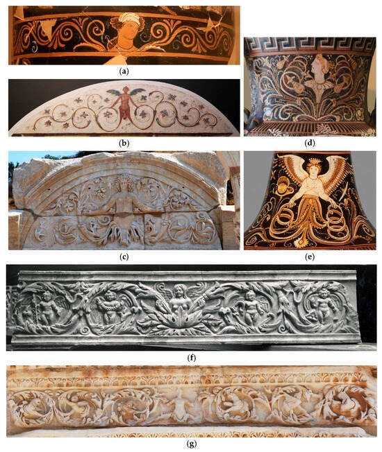 Figure 8c)—the former features a winged figure, and the latter a figure with animal claws—have lower bodies merging into acanthus leaves, arms forming a diagonal downward V shape, and hands grasping a vine on each side. In the 2nd-century stucco band decoration of the Roman tomb of the Valerii (illustrated in