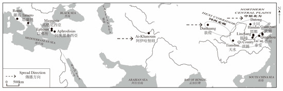 Given that no traces of the motif have been found in the Buddhist art west of the Hexi Corridor, comparable Chinese Buddhist depictions were likely the result of the creative absorption and adaptation of Greco-Roman motifs by Chinese communities, and can be regarded as the product of the Sinicization of Buddhism. The motif was probably introduced via objects linked to the Mediterranean rather than through the direct spread of Buddhism. These objects likely fall into two categories of Mediterranean cultural carriers: original Mediterranean goods and Mediterranean-style imitations made in Central Asia.