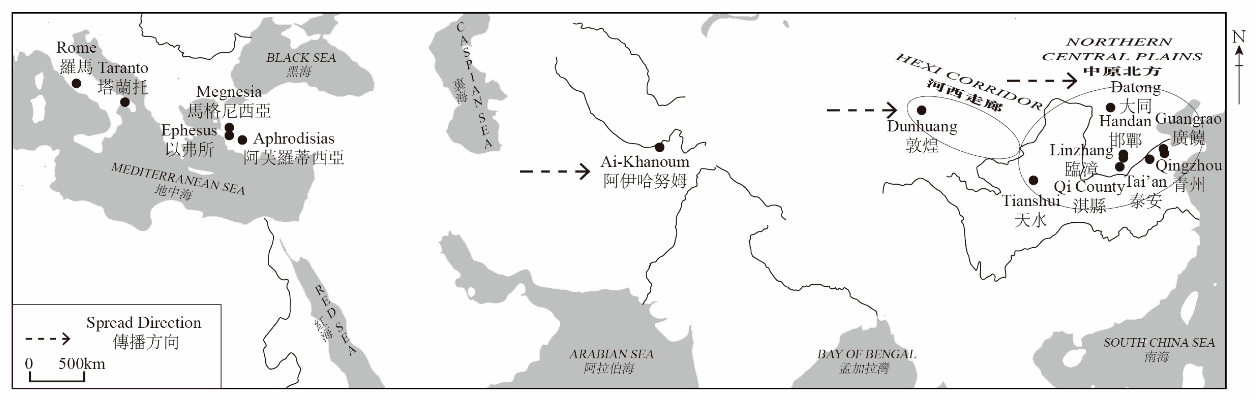In summary, the Greco-Roman motif of double-scroll central figures was transmitted to China via the overland Silk Road during the latter half of the mid-Northern Wei period, giving rise to two distinct yet interrelated iconographic systems: one in the Hexi Corridor and the other in the Northern Central Plains.