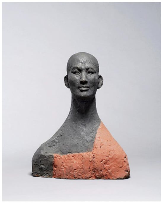 Kwon also produced various works, such as human figures and animals, captivated by the charm of terracotta. This material has endured and been maintained for a long time. For example, his Self Portrait, produced from 1969 to 1970, is a representative example (Figure 2). The self-portrait, which depicts him wearing a monk’s robe, a long neck made into a bust, and an expressionless but determined will, has his slender, oval-shaped face slightly lifted and his round eyes directed somewhat upward. Below the small face, a long neck is stretched out and gently flows down to the shoulders, forming an isosceles triangle and creating a bust. Significantly, the large eyes look into the distance, but rather than glaring or tense, they are calm and confident, not arrogant. This work shows a good harmony of Kwon Jin Kyu’s will and diligence for art as an artist. The monk’s red robe, which covers one shoulder, is divided in half, with the other shoulder in dark gray that can be seen below the neck, clearly revealing his artistic simplicity but pursuing the beauty of change and balance. This work, made using the terracotta technique of working with clay and then firing it once, has both the roughness and soft touch of the material. It shows his view of nature and his artistic philosophy, which sought to explore the essence of existence rather than technique while respecting the material’s properties. In addition, starting in the late 1960s, he stayed at temples more frequently than before and created many Buddhist statues. On 7 March 1971, while staying at Tongdosa Temple in Gyeongsangnam-do and creating Buddhist statues, he sent a letter to his nephew saying that Tongdosa Temple was a great place to study and that he was “about to finish making the first Buddha and to begin to produce the second Buddha (Yeol Choi 2011, p. 90).” The letter shows Kwon’s continued research on Buddhist statues and his devotion to Buddhism. Like this, Kwon Jin Kyu’s work is inspired by the appearance of traditional Buddhist monks, but at the same time, he reinterprets it as the present artist. It nicely captures his ability to reinscribe the past and his attempt at recreating dialog between the past and present.