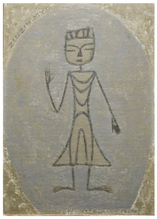 Another artist, Chang Ucchin, is an artist who, under the Buddhist tradition, has practiced Buddhist visual culture in our daily lives that can be approached by the public and the way we live today. Born into a devout Buddhist family, he met a Buddhist wife, and even without his help, his works are infused with the profound philosophical and religious thoughts and teachings of Buddhism (Yeob Choi 2023, p. 429). Chang says, “Just because a monk has abandoned the secular world does not mean he has abandoned his life. Rather, just as he has been given another responsibility to live with the Buddha and to carry out his will, art is also a way of life (Bae 2023, p. 23).” He visualizes nature, people, and our lives simply and warmly, making viewers happy and comfortable. Nevertheless, when people look inside his works, they can feel his countless hidden artistic efforts and passion, which seem to convey the profound truth of life beyond the understanding of art. Among his works, Zinzinmyo (眞眞妙) is a Buddhist-related painting that Chang Ucchin drew of his wife in 1970, which has the dictionary meaning of really incredible or truly outstanding beauty (Figure 3). He began the painting after seeing the image of his wife praying and titled the work after his wife’s Buddhist name, Zinzinmyo. For this piece, Chang spent countless hours agonizing over drawing to visualize the image, which led to his health deteriorating. Because of this, his wife worried and later donated the painting to someone else. In the work, a halo surrounds the entire body, and this oval halo is a typical background treatment seen in Buddhist sculptures. However, in Chang Ucchin’s case, the lower part is arranged in a straight line, which seems to represent a wife inside a lotus leaf, which symbolizes the purity of Buddhism. The texture of the oil painting is emphasized through matière treatment, and the figure’s flat, beige, and light brown tones, and the deep contrast of the lotus flower, reflect the balance of the entire screen well. The face is evocative of meditation or prayer, and the head is not a crown but a vertical line, the opposite of the horizontal depiction of the face and eyes, expressing his wife as a bodhisattva. However, the hand gesture, ‘Do Not Fear’ mudra, shows a Buddhist image welcoming believers, reflecting the loving appearance of a wife who always warmly welcomes him while praying. In order to emphasize the true faith and cultivation of the Bodhisattva, the upper part shows U-shaped draperies, but the lower part is drawn in the primary, free-spirited form of the body, like the style of the Buddha’s iconography that was unified in the Gupta period of India, which depicted the body with light robes. In particular, the bare feet and the omission of ornaments are also images of a frugal wife, but Chang’s art, which does not simply depict the image of a traditional Buddhist bodhisattva but modernizes and simplifies it, shows how he reinterprets and develops images from the past. In addition, this work, which uses his wife as its subject, shows us how Buddhism, a religion that is a legacy of the past, still exists in our lives today.