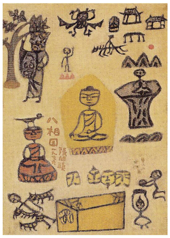 A Buddhist painting, Palsangdo (八相圖), depicts essential events in the life of Shakyamuni, such as his birth, leaving home, training, enlightenment, and nirvana, in eight panels. Although Buddhism originated in India, it was visualized more diversely in East Asia according to their religious preferences. Palsangdo began to be produced earnestly in Korea from the early Joseon Dynasty. The eight events seem to be derived from the central tenets of Buddhism, the Four Noble Truths and the Eightfold Path. Chang Ucchin’s Palsangdo: Eight Scenes from the Life of Buddha shows the condensed expression of lines that he has developed and, at the same time, the transitional process of his later transformation into the painting style with black ink (Figure 4). While traditional paintings are painted on eight screens each, Chang collects eight stories into one on a small screen and handles them in a simple yet innocent, childlike style (Yeob Choi 2023, pp. 432–33). It also feels like the thick lines are drawn with black ink, not the colors of traditional Buddhist paintings. Even in terms of subject matter, it has its own variation, starting with the process of Maya, the mother of Sakyamuni, giving birth to Buddha in the upper left and progressing clockwise. Next to his mother’s scene is a baby Buddha with his hands raised to the sky, and on the upper right is a scene depicting the grown Buddha becoming a monk. This scene is transformed into a form that seems to show the traditional Korean temple style, such as the main gate, visualizing the Koreanness and popularization of Buddhism. In the middle right, clockwise, there is a Buddha who achieves true enlightenment after practicing and becomes a Buddha. In the lower middle is a Buddha entering nirvana, with the soles of his feet replaced on the pedestal. People are depicted together in a scene trying to receive the Buddha’s relics, and on the lower left is a famous Jataka story from one of the Buddha’s previous lives, where he sacrificed his body by jumping off a cliff to save starving tiger cubs, showing the Buddha’s process of nirvana. After that, a magpie, which symbolizes the people in Korean folk paintings, is placed on top of the Buddha’s cross-legged seated statue, seeming to show how Buddhism has become popular among the people and how it has been teaching them in Korea. Finally, the Buddha statue in the center of the screen is in the mudra, touching the ground. It is also shown in one of the famous Buddha statues in Korea, the Buddha of Seokguram Grotto. The legs are in the lotus position; the right hand is placed on the right knee with the fingertips touching the ground, and the left-hand palm is facing the sky and placed naturally in front of the navel. This mudra depicts Sakyamuni overcoming all obstacles and attaining the path.
