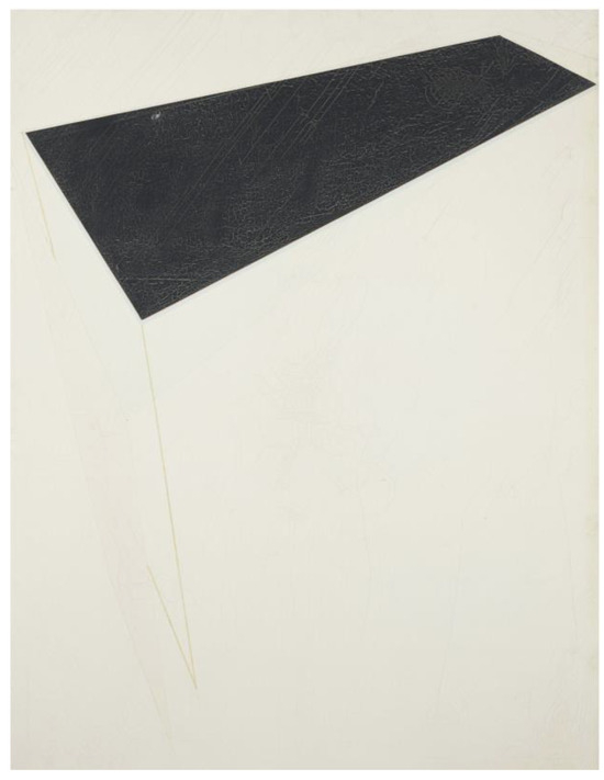 Suh Seung-Won’s early works were inspired by traditional Korean culture, such as white porcelain, a Korean traditional house (Hanok) window paper, and geometric patterned door frames, and established the theme of simultaneity, which included a modern sense of design esthetics in a society that was rapidly industrializing at the time (Yoon 2016, p. 2). Since 1963, he has taken simultaneity as a proposition and has sought to show what can be simultaneously expressed through him in the world of peace by making the invisible visible (Chun 2010, p. 106). It allowed him to develop his artworks that utilized geometric forms earnestly, using the proposition of ‘simultaneity.’ For example, his Simultaneity 69-H is a work with a black square tilted diagonally at the top of the screen (Figure 5). This work was used as the cover of the first magazine published by AG (The Korean Avant-Garde Association), an art group formed in 1969 to pursue experimental and modernized new art (M. Kim 2024a, pp. 42–44). When used as the magazine cover, a red line was attached to the front side of the black square to emphasize its three-dimensionality. At the same time, the red letters ‘AG’ at the bottom and the black letters in the rest of the area were in harmony with the overall screen, emphasizing the characteristics of AG, an art group that attempted simple but new forms. In the original Simultaneity 69-H, the slanted rhombus shape at the top is composed of a geometric form in which the back is smaller than the front, giving a sense of space while being flat. In addition, thin black lines run vertically down the screen below the two front sides. Among them, the line closest to the viewer below the screen is drawn at the same angle as the side of the black square above, leading the viewer to imagine a space where the flat square does not look like a hexahedron. However, at the same time, all the lines are composed so that some are visible or invisible, showing how much Suh Seung-Won himself values formative order and harmony while also making the two-dimensional picture screen look three-dimensional and further providing the viewer with an opportunity to create an imaginary world within the screen in multiple dimensions. Suh Seung-Won says, “Simultaneity means making the invisible visible, allowing what happens in the world of nirvana to be expressed through me simultaneously, and it is the pursuit of identical and equal time and space. My work explores strict formative order and the space of harmony, and I try to capture physical time simultaneously with action and mindfulness” (Suh 2011, pp. 80–81). Thus, the mindfulness Suh means Korean uniqueness and modernity that can be recognized as globalized, while at the same time emphasizing a universal world of thought that goes beyond abstraction and breaks down the boundaries obtained from simplified and organized informativeness.