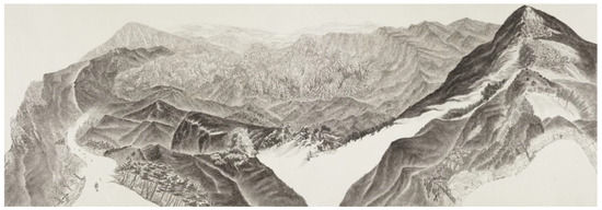 What he first valued was the encounter and connection between people and nature. Just as in Buddhism, a person’s past and present lives are linked, and all of them come together to determine the next life, or people are connected with profound relationships; he established the space of Korean nature as a place where people with connections meet each other, and at the same time, a place where humans meet and reflect on themselves, and he began to produce landscape paintings that could meet and connect with people by putting these ideas into works. For example, in order to draw a mountain that people visit, he walked around the mountain himself and gathered sketches to create a single work, which is the same method as traditional landscape painting, but to understand the subject of the hill, Cho Inho began to draw his Warped Landscape series in which all parts are visualized from multiple angles, rather than the easily recognizable shape of the mountain, by stitching and gathering parts of the hill depicted from various moving points (Figure 7). In particular, the spatial composition that gives a sense of three-dimensionality by overlapping parts depicted from multiple angles and heights is expressed in black ink, which enhances sufficient liveliness. In addition, through the coexistence of ink lines that contain the roughness and softness seen in traditional ink paintings and detailed or abstract object descriptions, people know the picture depicted as a complex natural appearance that is different from the actual landscape at first glance and through profound observation, they feel as if they are in that place, contemplate human existence through nature, and think that each person living in the world should live with a precious heart just as a single blade of grass, which is considered insignificant, is essential. It establishes a modernized, participatory landscape painting that induces active participation. In this way, his art expresses affection for a world where we respect insignificant things and people live harmoniously. It represents the Buddhist idea of cause and effect, which states that everything is connected beyond nature and people and people to people.
