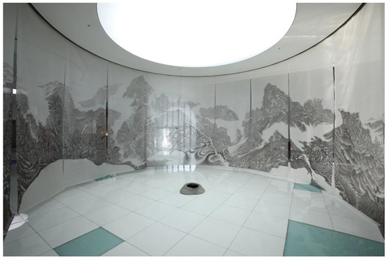 Traditional East Asian and Korean landscape paintings frequently describe nature, are mostly painted on paper or silk, and are made into hanging scrolls or handscrolls. Cho Inho, who pursued the modernization of landscape painting, attempted to make landscape painting three-dimensional. For example, his work, Enlightenment [Gyeonseong (見性)]–Gujeongbong, is arranged as a hanging painting that naturally moves in the air, allowing the audience to freely move around the work and become one with it (Figure 8). The screen is wrapped in eleven pieces of silk cloth and arranged to flow naturally from the wall, creating another space within the exhibition hall and providing an entrance space for visitors. Young-Taek Park explains, “Cho draws each world with a brush on a piece of cloth and captures it in ink. The mountains, which are living things, writhe with a strange power, and the painting is spread out in a circular space, heightening the feeling as if the entire mountain is being viewed in order” (Y.-T. Park 2011, p. 1). In particular, the nearby nature was depicted with rough and spontaneous brushstrokes, giving it a sense of liveliness swaying in the wind. At the same time, the distant landscape was painted with dense and compact brushstrokes, utilizing various techniques and styles. When the viewers go inside the installation space, they see a stone filled with water in the shape of a well placed to express the scene where Cho Inho observed himself reflected in one of nine stagnant water halls on the peak of Gujeongbong in Wolchulsan (or Mt. Wolchul), Korea. Cho states, “I installed this piece with the theme of meeting nature and myself while hiking by directing a scene of meeting myself by looking at my reflection in a well at the peak of Gujeongbong (M. Kim 2024b).” The piece’s title, Gyeonseong (見性), comes from Seon Buddhism (also known as Zen or Chan Buddhism) and says that one can achieve enlightenment and become a Buddha by facing one’s mind and seeing one’s original nature. The term ‘Gyeonseong’ was interpreted by the artist as enlightenment. Enlightenment means that the Buddha realized the truth about the cycle of life and death, became liberated entirely from that cycle, and revealed the spiritual path he had rediscovered (Cantwell 2010, pp. 24–26). The work allows the audience to experience Cho’s wish, “if one naturally meets oneself and knows oneself, one will also know the world and be free, if not liberated (M. Kim 2024b).” In order to reflect on himself, Cho Inho, who has become more solid and built a full-fledged art world, shows through his works how diverse an object can be beyond a simple depiction of the nature of Korea. In such a way, in nature, which is described in detail or broadly, we can see how many relationships and connections a human has without realizing it and how they live as one of nature. Contemporary Korean artists such as Suh Seung-Won and Cho Inho, who are profoundly inspired by Korean tradition and nature, show how today’s visual culture can be connected to the field of religion and integrated in a broader way to create a synergistic effect.