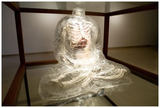 Since the 1990s, Michael Joo has been asking people questions through influential works that expose the meaninglessness of dichotomous perception between the East and the West and promote change in people’s prejudices. While visiting the transpacific regions, he primarily collects various materials and creates them into artworks with multilayered meanings and messages. His works also show the infinitely expanded scope and role of the field of art today through the consilience of various scientific fields such as chemistry, geography, ecology, and the humanities, including philosophy, religion, and anthropology. For example, Michael Joo’s Visible is a headless urethane cast piece depicting a Buddha meditating in a lotus position (Figure 9). The exposed body has a dissected shape with all bones and internal organs visible under transparent skin that combines Buddhism, one of the representative Asian religions that originated in India, and anatomy, a field of science that values accuracy and reality. Hyunsun Tae notes that ‘the viewers’ gaze can freely move in and out of an engagement with Buddha, which turns the visible and invisible boundaries into two-way flows (Tae 2007, p. 39). The two-way flow overlaps the sacred Buddha’s existence and the physical human body. The traditional religious Buddha’s body has been created to be constantly viewed with reverence, but Joo’s Buddha allows visitors to take a close look at the Buddha’s invisible inside of body. The Buddha’s body is also trapped in a metal frame, pointing out humans’ narrow vision and perspective. It suggests how we need to break away from the typical frame of human assumption. The Buddha’s face, which conveys many religious meanings and symbols, is intentionally omitted, and the transparent shape of the body is emphasized, disturbing the viewer’s straightforward interpretation. Michael Joo’s interest in Buddhism began during childhood in an environment where Christianity and traditional Korean Buddhist practices coexisted with his household—Christian mother and Buddhist father. In addition, growing up with his parents, who were scientists, he was also a science student who went to college to major in biology before majoring in art, which allowed him to naturally incorporate science into his art. Young Paik Chun’s evaluation highlights Joo’s artistic ambition to merge cultural discourse with scientific rationality and cultivate a sense of creative originality that transcends conventional boundaries by incorporating reality, authenticity, and veracity themes into his artworks (Chun 2009, p. 301). The absence of a face can obliterate individuality, but the meditating posture of the body still brings up the image of Buddha. The visual fluidity, displaying the body without a face, that Michael Joo intentionally provided with places of reversal conveys the profound possibility and Buddhist teaching for any living being to become a good teacher, Buddha, if they attain enlightenment. Moreover, the Buddha’s hand gesture, called mudra, in Joo’s statue, illustrates the meditation mudra that helped Buddha obtain enlightenment. The thumbs of both sides are placed together, and the back of the hand is naturally placed on the foot in the lotus position. Ronald Jones says, “Joo has metaphorically uncovered the corporeality of the man called Buddha from beneath the cultural mock-up that has subsumed Buddha’s original identity over the centuries, and this is where his irony sings. He has made his individuality transparent in order to sacrifice it to a universalizing form of cultural artifact (Jones 1999).” Joo’s Visible illustrates that anyone or anything can become a Buddha, and his art goes beyond simply dealing with race and dichotomous East–West concepts. Michael Joo confesses, “I think people are exaggerating my identity, but I am more concerned about racial ambivalence than that. I explore complex issues of ambivalence, such as the relationship between nature and civilization, my inner self, and the outside world (Lee 2006).” The same year, Michael Joo presented an expanded version of Visible in Headless. This work combines the Buddhist sculptures seen in the former piece, Visible, with the faces of various characters and dolls to create a fusion of diverse forms.