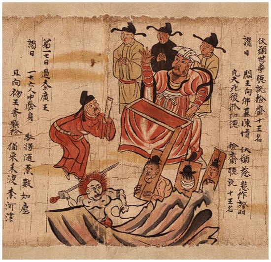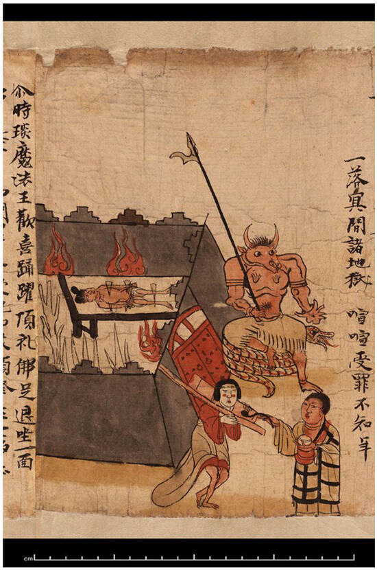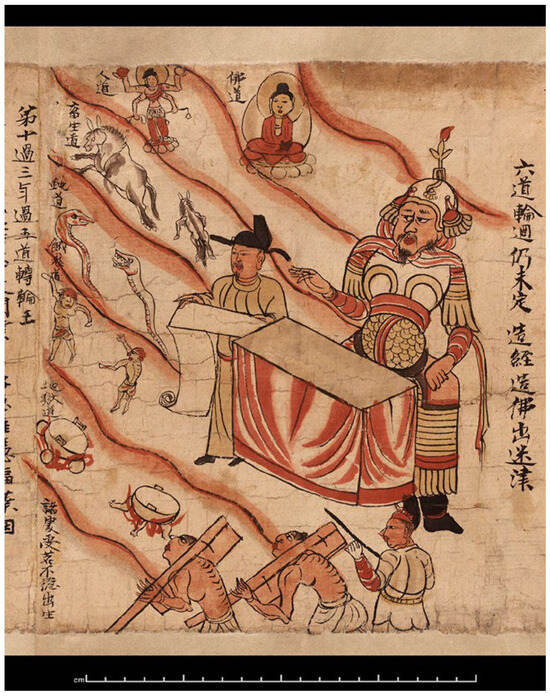 The Wheel–Turning King of the Five Paths in S.3961, an illustrated manuscript scroll of the Sutra of the Ten Kings in Chinese. ca. 10th–11th century AD. Downloaded from International Dunhuang Programme (IDP) at https://idp.bl.uk/collection/2ED6F9800FD74DE08CBB9CB2F8E5D7BD/ (accessed on 1 August 2025). © British Library.