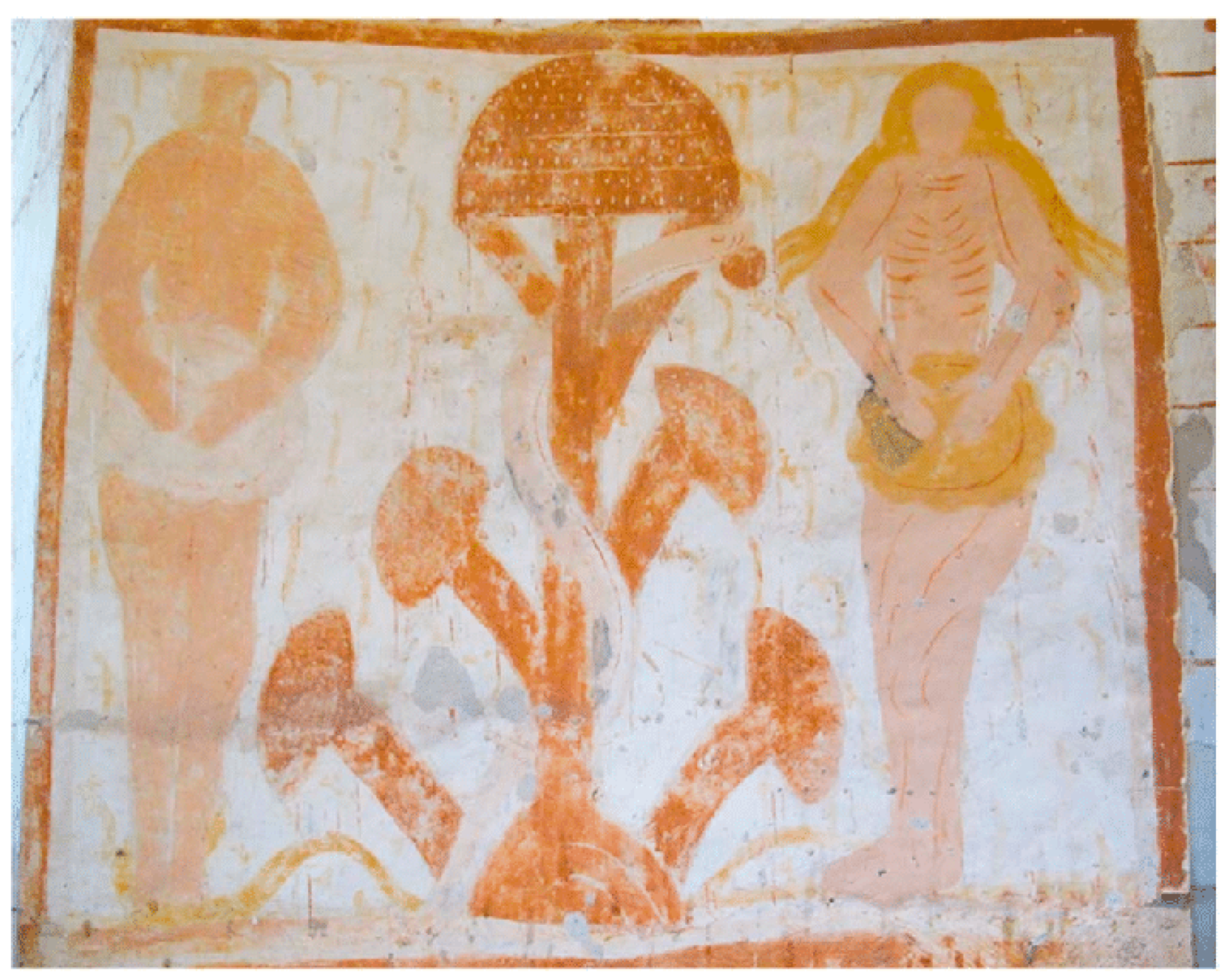 The whole Eden story is mushroom-based mythology, not least in the identity of the “tree” as the sacred fungus…Even as late as the thirteenth-century some recollection of the old tradition was known among Christians, to judge from a fresco painted on the wall of a ruined church in Plaincourault in France…There the Amanita muscaria is gloriously portrayed, entwined with a serpent, whilst Eve stands by holding her belly”.