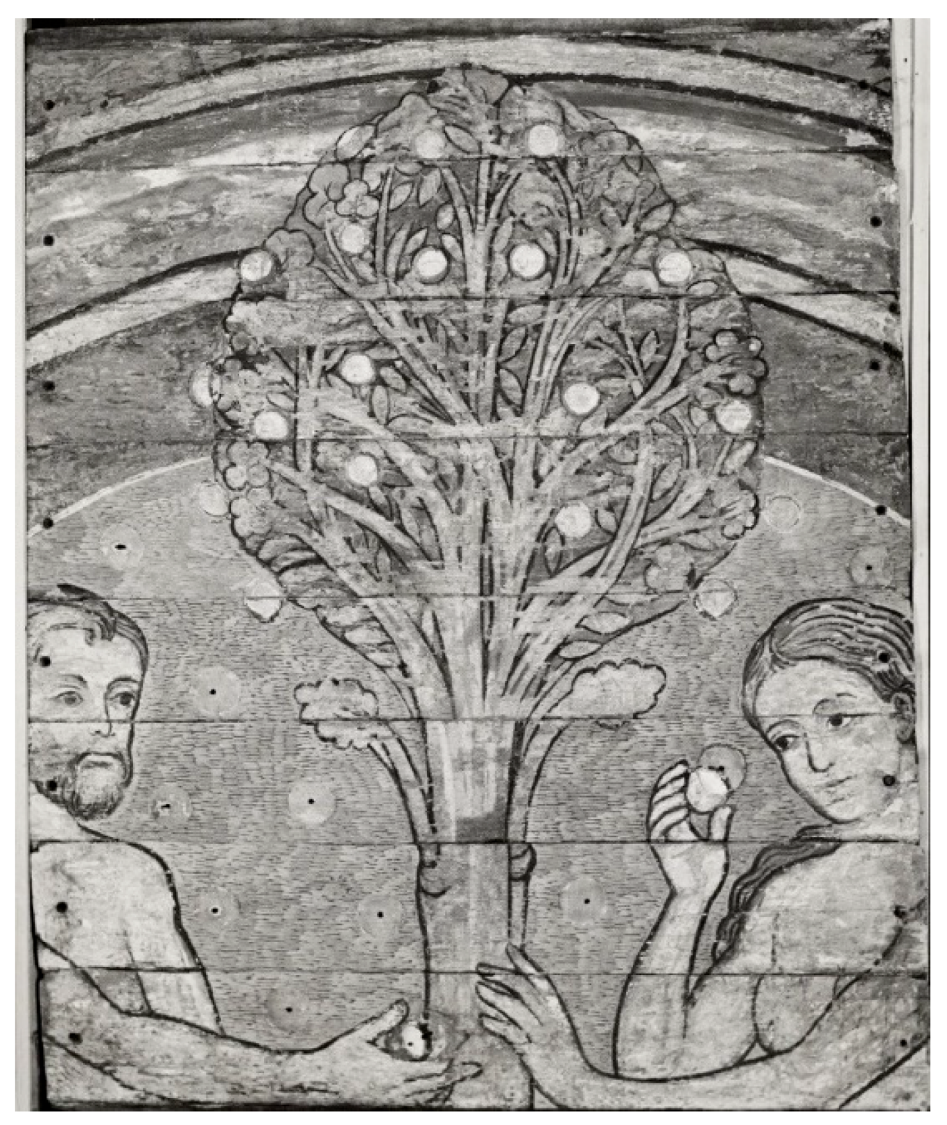 What we now see when viewing the Plaincourault fresco is only the remnants of a largely defaced original. We can get an idea of the extent of deterioration from the fact that the figures originally had faces. These are not visible on most photographs, but archaeographer Carolina Sarrade of the University of Poitiers informs me they are still slightly visible.