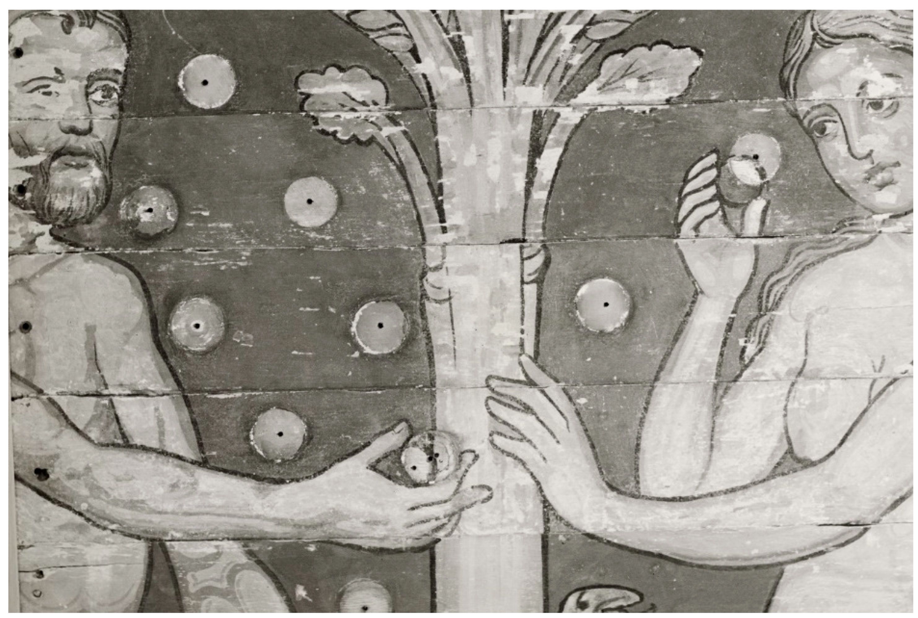 13 That more detail was originally intended is probably also suggested by the incised features in the plaster marking out Adam’s limbs, his fig leaf, his eyes and his pupils. The same was done with the snake, which also retains raised white dots. Also remaining on the current picture is a small remnant of a black line on Eve’s little finger (