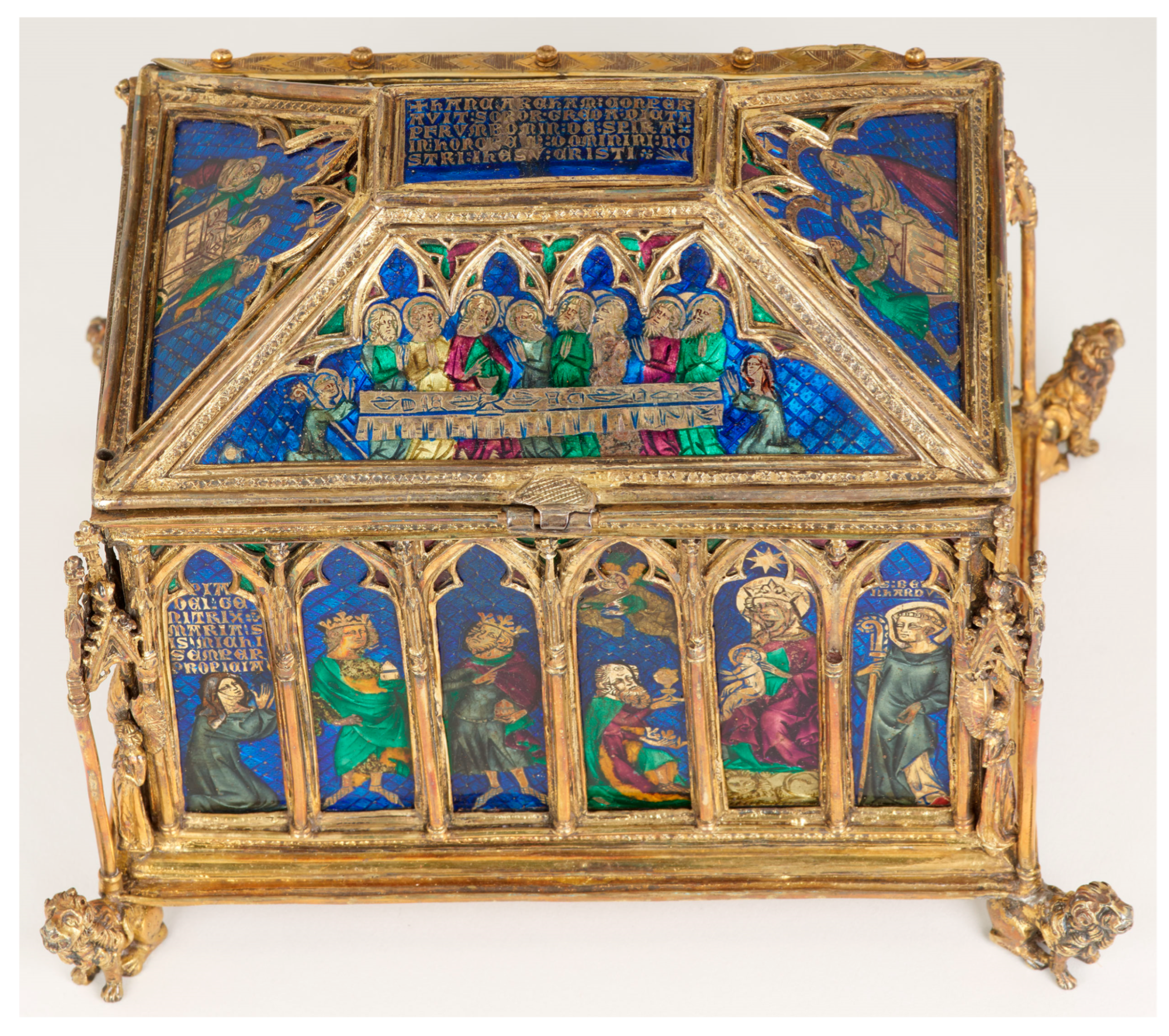 | 30 | Greda was the daughter of an nobleman from Speyer whose name was Albert Pfrumbom. The inscription enunciates: “Hanc archam conperavit [sic] soror Greda dicta Pfrumbomin de Spira in honorem Dominini [sic]/This casket was purchased by Sister Greda Prufmbom of Speyer in honor of God”. For the history and stylistic analysis of the work, see: (Wipfler 2020, pp. 570–76). |