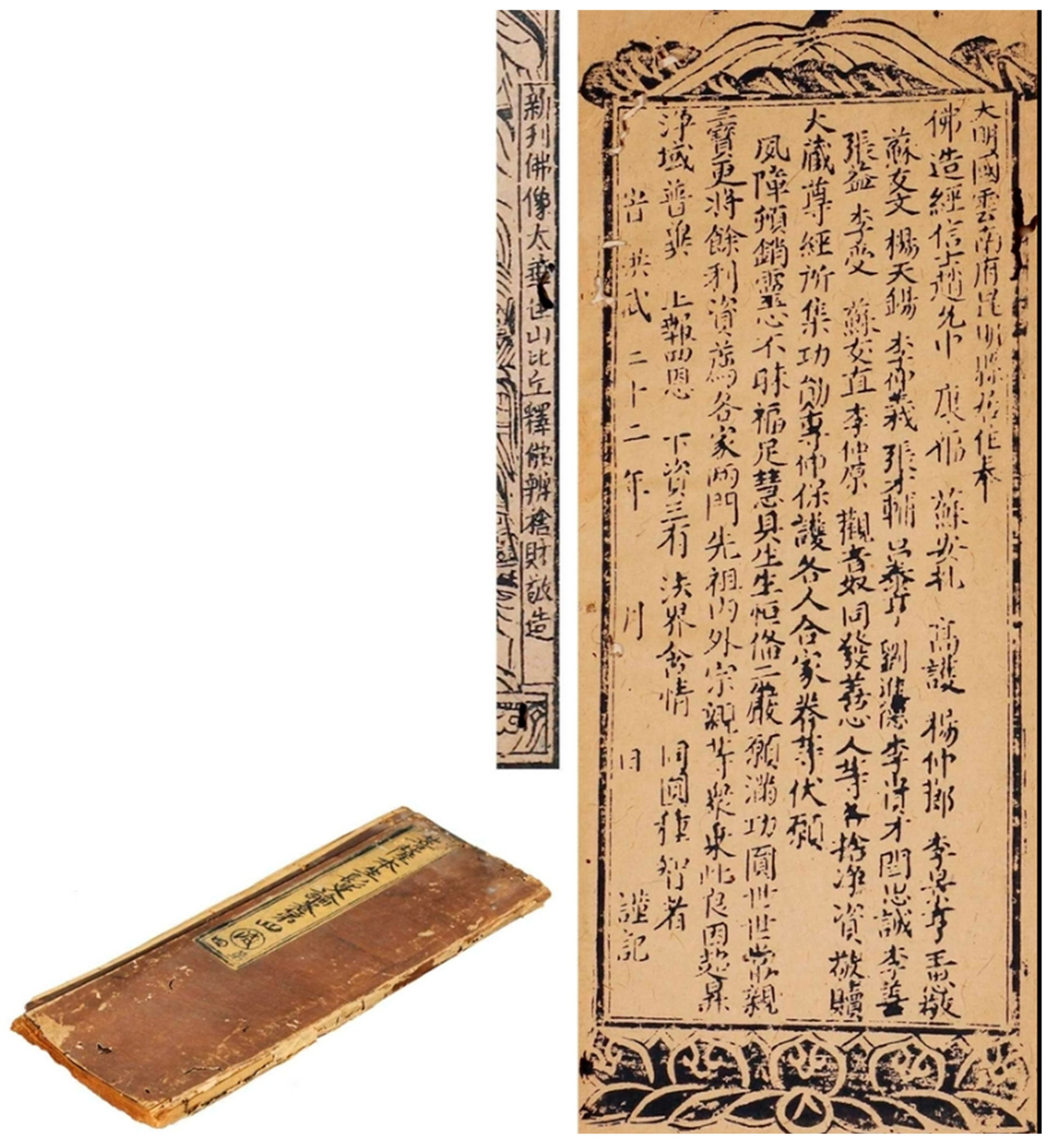 “Buddhist devotees Mrs. Liu 劉氏, Zushibi 祖師婢, her sons (Wentong 文童, Shutong 書童), daughters (Guixiangnu 桂香奴, Tianxiangnu 天香奴, Huixiangnu 回鄉奴), and all her family members, donated money and property to request a set of Mahāprajñāpāramitā Sūtra, totaling 600 volumes. The merits she gathered would assist the soul of Li Guanyin Bao 李觀音保, her deceased husband, who was a general and a commander. The merits would assist the grand-father, father, mother, and also Mrs. Liu’s parents, and their relatives. They may ride the boat of compassion of Prajñā to the other shore of Bodhi. I wish that my family will be blessed with good fortune and that my life will be prolonged. I wish that all obstacles for liberation would be eliminated. All souls would not be deceived. All people enjoy happiness and obtain full wisdom. The happiness and wisdom will go down from generation to generation. As parents have made perfect merits, all descendants will worship the Three Treasures: the Buddha, the Dharma and Sangha. The fourfold of graces, the grace of the Buddha; the grace of parents; the grace of the state; and the grace of fellow beings the grace of parents, will be repaid. The merits I have made will be share by all people. People in the world will share sympathy, and perfection and wisdom. Twenty-second year in the reign of Emperor Hongwu (1389).”