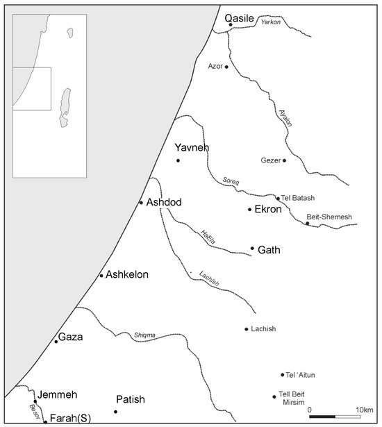 The Philistines are a group of people mentioned in the Old Testament, especially in the books of Judges and 1Sam. They are described as foreigners coming from ‘Kaphtor’ and settling in five main sites (the ‘pentapolis’): Gaza, Ashkelon, Ashdod, Ekron, and Gath, in the southern coastal plains of Israel (Figure 1; for example, T. Dothan 1982, pp. 13–20; Dothan and Dothan 1992, pp. 3–11). They are usually mentioned in relation to conflicts with the Israelites during the tribal stage and early monarchy, eventually subdued by King David (e.g., Knauf 2001). In Egyptian texts, the Philistines (Pršt) are mentioned as one of the ‘Sea Peoples’, creating disorder during the 13th–12th c. BCE, eventually subdued by Ramesses III (e.g., T. Dothan 1982, pp. 1–13; Dothan and Dothan 1992, pp. 13–28). During the Iron Age II, local kings of Philistine cities such as Ashdod and Ekron are mentioned in Neo-Assyrian texts (e.g., Tadmor 1966; Ehrlich 1996).