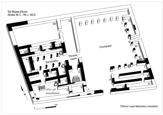 The large-scale olive oil industry at Ekron during the 7th c. BCE was probably part of this reality. There are different views about the initiation, interest, control, and maintenance of the massive olive oil industry at Ekron (as well as other sites of the Iron Age IIB-C Shephelah). It may have been initiated as part of the Neo-Assyrian imperial vassal system, flourishing during the ‘Pax Assyriaca’, and continuing through to the days past the Assyrian control in the final decades of the 7th c BCE (e.g., Gitin 1995; Na’aman 2003). Faust emphasized the role of the local ethnic states, in particular Israel, Judah, and Philistia, in the development of the olive oil industry, and the new trade routes and markets during this period (e.g., Faust 2011; Faust and Weiss 2005, 2011). In particular, Philistia with its large ports had a central role in the Maritime international trade, together with the Phoenician cities (e.g., Master 2003; Faust 2011). The royal inscription dedicating the temple at Ekron to a goddess with an Aegean name, by a Philistine king, supports the association of the temple complex, the elite zone, and related olive oil industry during this period with a local rather than an imperial administration. Whether the large-scale olive oil production and distribution system of Ekron was initiated, influenced, or controlled by the Neo-Assyrian empire, or by an enterprise of a local relatively independent enterprise, or a balance between the two, it had to be administrated by some central ruler, due to its scale (smaller-scale olive oil industries at Samaria and Judah may have operated differently, Faust 2011, pp. 66–70). This probably generated the need or justification for the temple complex as a redistribution and control center, and its religious and cultic characteristics, and other related cultic practices.