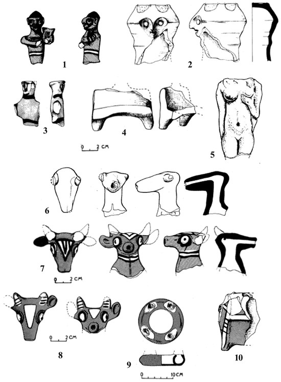 Area M at the lower city of Ashdod also contained a potters’ workshop from the Iron Age IIA period (Stratum X, Phase a, Kiln 7202, Phase b, Kiln 7028, Dothan and Porath 1982, pp. 7–8, 52, Plan 4). Here, a bird-shaped rattle may be a cult-related object (Figure 2(5); Dothan and Porath 1982, Figure 6:4). Several kilns were found in Area K on the western slope, Stratum VI, of the 7th–6th c. BCE (Dothan and Ben-Shlomo 2005, pp. 55–60), yet no cultic artifacts were related to them.