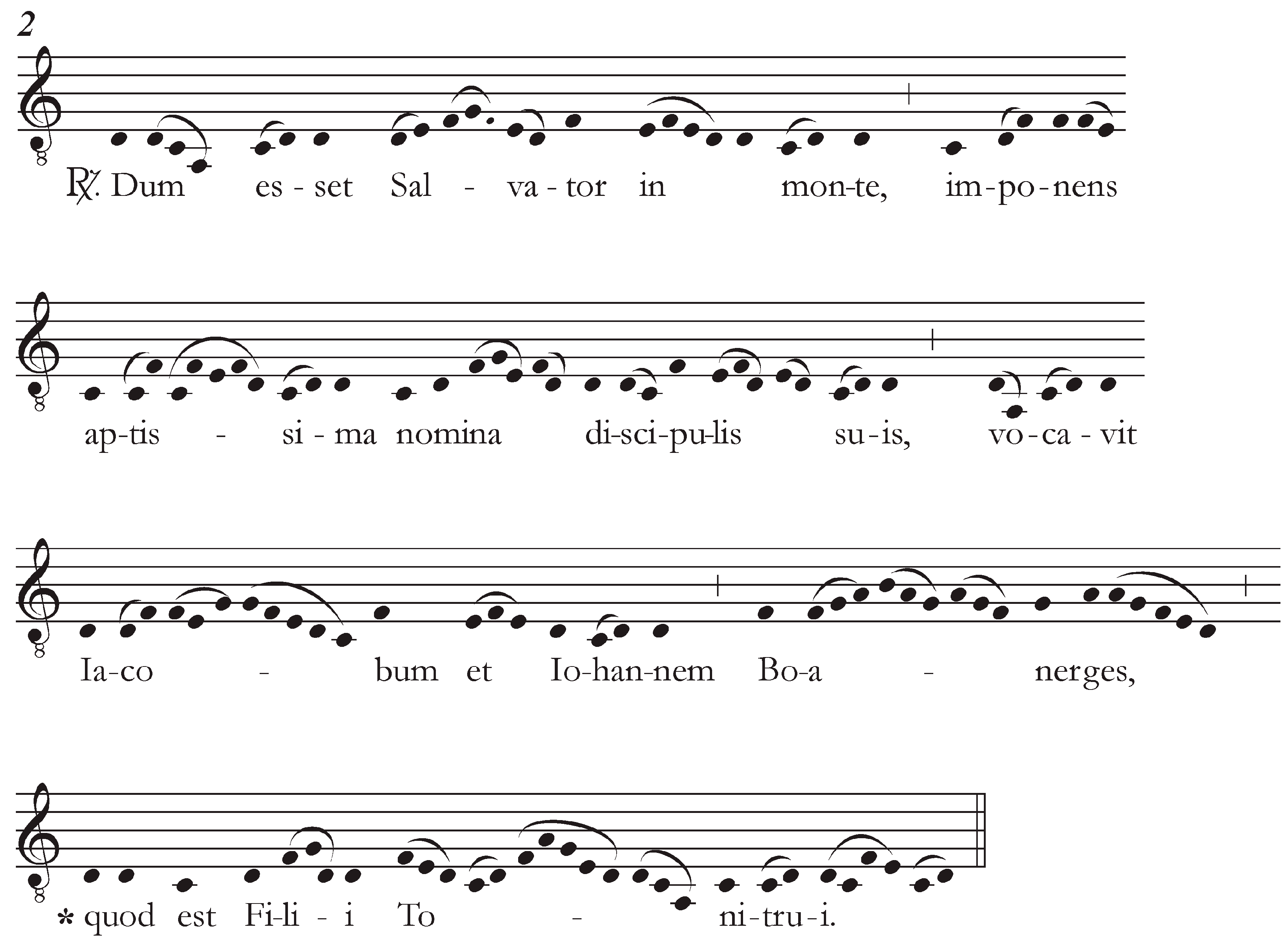 | M-R2 | R: Dum esset Salvator in monte, imponens aptissima nomina discipulis suis, vocavit Iacobum et Iohannem Boanerges, quod est Filii Tonitrui. | Respond: While the Savior was on the mountain, He gave most fitting names to His disciples and He called James and John “Boanerges,” which means “Sons of Thunder.” | Mark 3:13, 17 (Ihesus vocavit text) |