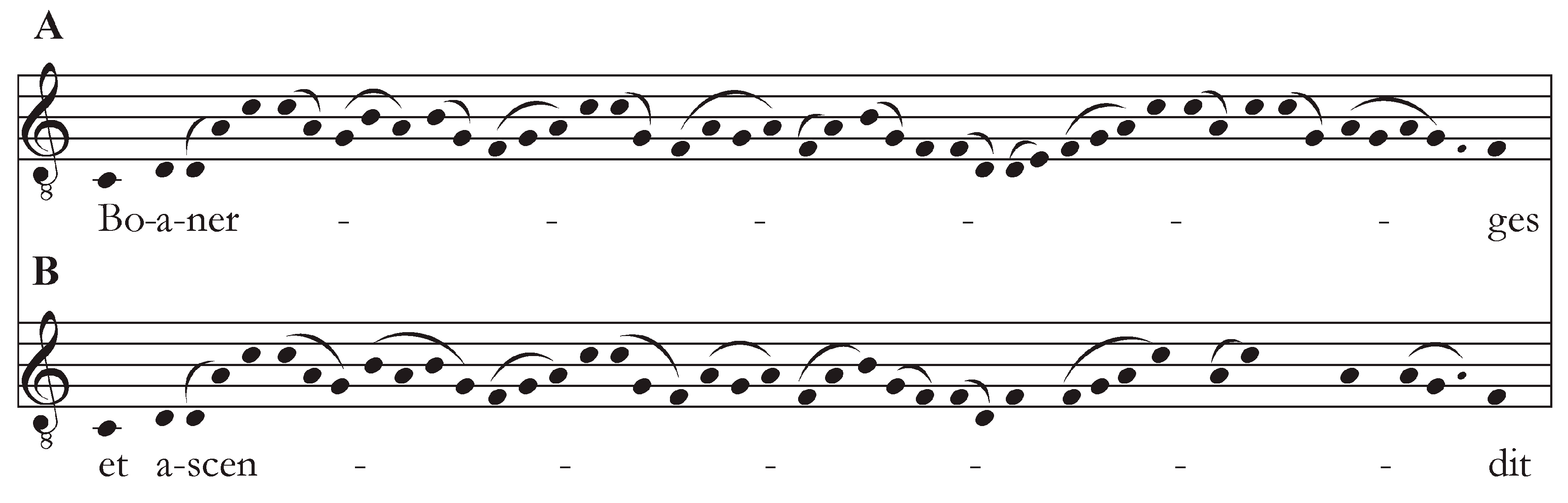 | 56 | Identified by (Roncroffi 2009, p. 77). The common practice of contrafactum, by which new texts were set to existing melodies, generated families of medieval sequences related by a shared melody, “creating an interplay of exegetical meanings,” as noted by (Hamburger et al. 2016, vol. 1, p. 213). |