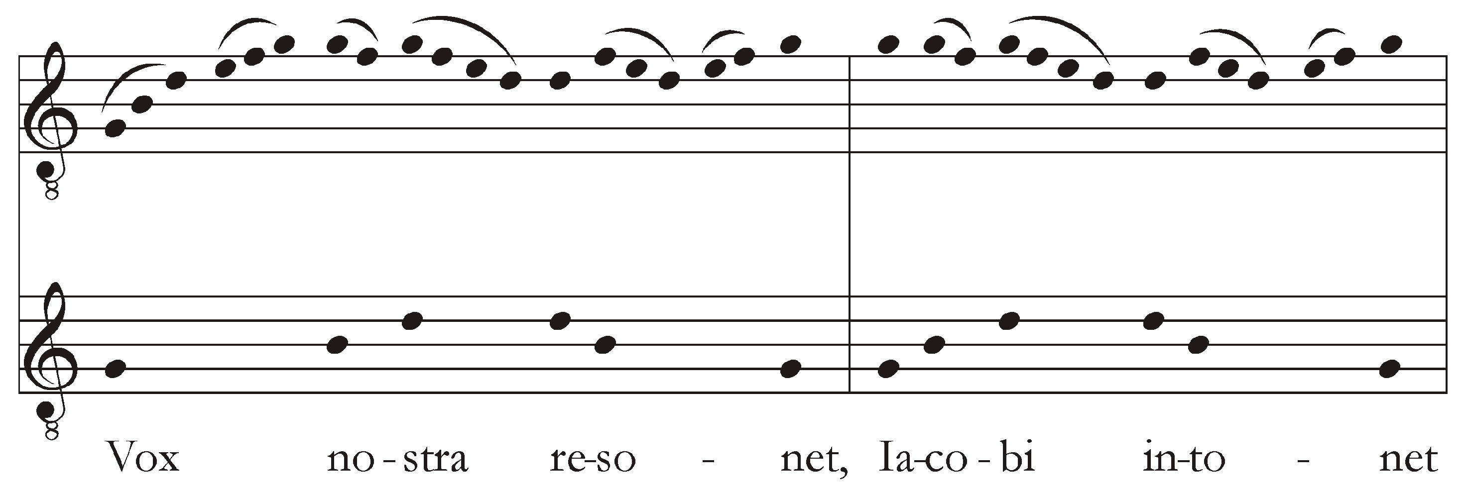 | 1 | Vox nostra resonet, Iacobi intonet laudes Creatori.27 | Let our voices resound and thunder the praise of James to the Creator.28 |