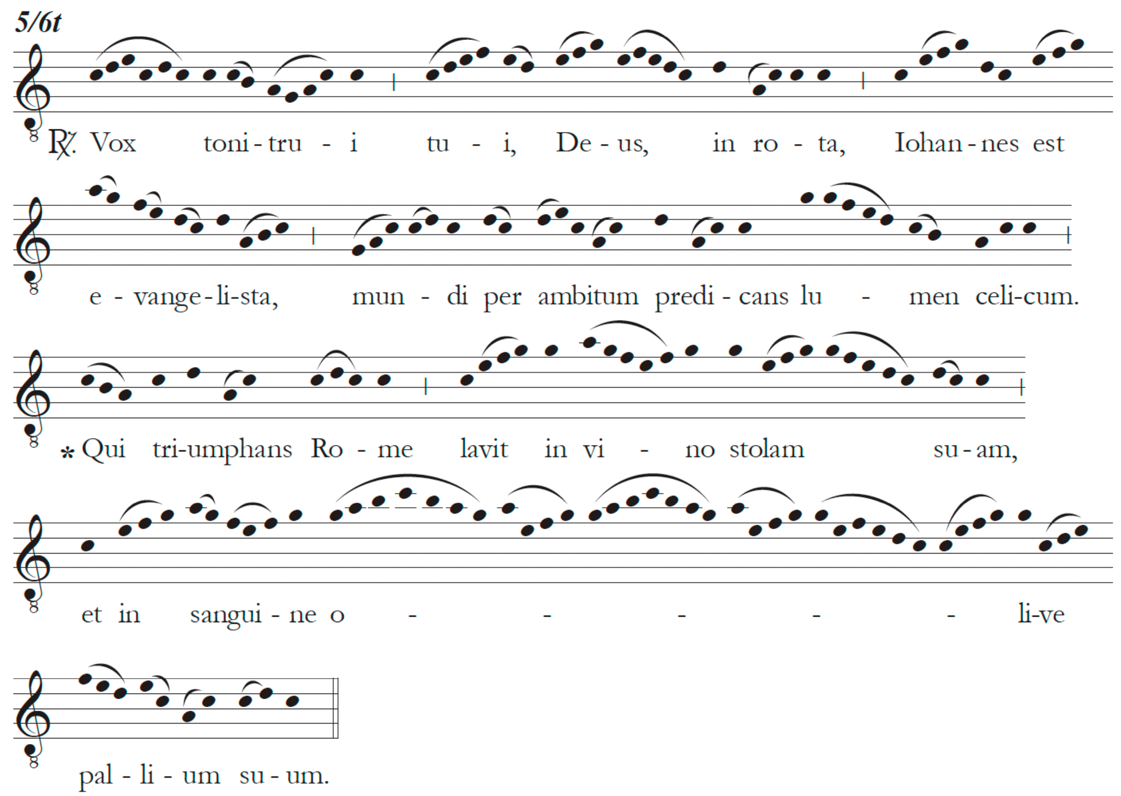 | R: Vox tonitrui tui, Deus, in rota, Iohannes est evangelista, mundi per ambitum predicans lumen celicum. Qui triumphans Rome lavit in vino stolam suam, et in sanguine olive pallium suum. | Respond: The voice of thy thunder, God, in a wheel; John is the evangelist preaching the heavenly light throughout the orbit of the world. Who, triumphing in Rome, washed his robe in wine, and his cloak in the blood of the olive. |