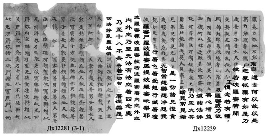 (1) Дх12229, from the Russian Collection vol. 16, p. 75A14. The fragment is missing its beginning and end, with additional damage along the lower portion. As shown in the right part of Figure 5, fourteen incomplete lines are preserved, containing 2–12 characters per line (only character fragments remain in the first line). The script is clerical script, executed between ruled lines. The original scroll is untitled; it remains unidentified in the Russian Collection, but the Catalogue of the Dunhuang Manuscripts in the Russian Collection (Tai 2019) provisionally designates it as “Mahāprajñāpāramitā-sūtra, juan 8, Mie Zheng Pin 31” (《摩訶般若波羅蜜經》卷八·滅諍品第三十一).