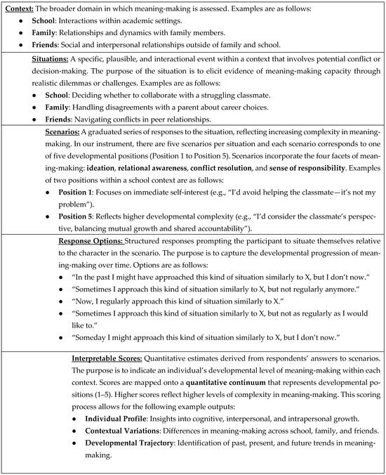- O’Keefe, Theresa A., Larry H. Ludlow, Christina Matz-Costa, Henry I. Braun, Ella Anghel, and Olivia Szendey. 2022. Measuring the development of meaning-making. Paper presented at the Annual Meeting of the American Educational Research Association, San Diego, CA, USA, April 21–26. [Google Scholar] [CrossRef]