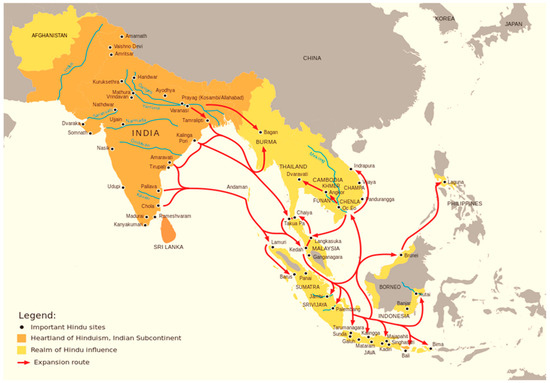 The historical spread of Hinduism in Southeast Asia (https://commons.wikimedia.org/w/index.php?curid=141850972, accessed on 10 June 2025).