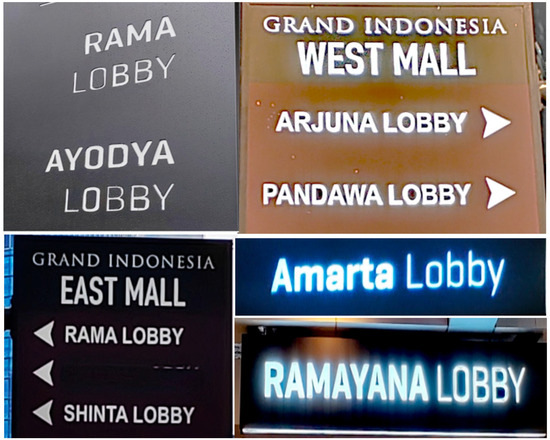 First and foremost, a salient feature in Jakarta’s LL has to do with the explicit mentioning of key Hindu deities and Hindu epics. In Jakarta and surrounding areas, for example, several official street and road names feature Hindu elements. These include ‘Jalan Jatayu’, ‘Jalan Garuda’, ‘Jalan Hanoman’, ‘Jalan Shinta’, ‘Jalan Arjuna’ and ‘Jalan Rama Raya’. Interestingly, in the high-profile Grand Indonesia mall in central Jakarta, several lobbies are named after key figures in Hindu epics such as Ramayana (Figure 8). These major Hindu figures and stories include Ramayana (major Hindu epic), Rama (a major figure in Ramayana), Ayodya (or ‘Ayodhya’, a sacred city in northern India that is believed to be the birthplace of Rama), Shinta (‘sinta’ or ‘Sita’ a major figure in Ramayana), Arjuna (a key figure in Hindu epic Mahabharata), pandawa (a group name referring to the five legendary brothers who are key figures in Mahabharata), Amarta (or ‘Amrita’, which means “immortality” and “elixir” in Hinduism). These Hinduism-inspired lobby names are full of symbolic meanings. Such high prominence of Hinduism is surprising, creating a great sense of contrast in a Muslim-majority country. Notably, the Hindu elements are (re)contextualized in Indonesia with localized spellings. For example, Shinta/Sinta is the local Indonesian way of spelling ‘Sita’, and ‘Ayodya’ is the local way of spelling ‘Ayodhya’. Similarly, various Hindu names have also been localized and recontextualized in places such as Thailand with local spellings, as a result of cross-region civilizational contact (cf. Gu 2025a). Some of the Hindu figures are commonly portrayed in wayang kulit (a traditional form of shadow puppetry found in Indonesia and the Malay world). Wayang kulit, essential to Indonesian culture, typically is based on Hindu epics such as the Ramayana and Mahabharata. In many ways, wayang kulit represents Hindu epics (re)contextualized in a Southeast Asian context (cf. Figures 24 and 25 for more details).