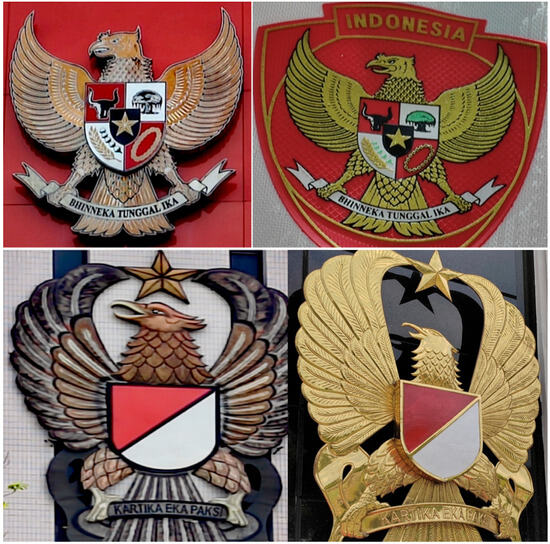 In Jakarta’s linguistic landscape, various mottos and slogans with partial/complete Sanskrit origins are also widely visible (Figure 14). Appearing alongside the bird-like Hindu deity Garuda (cf. Figure 15 and elsewhere for more details), these mottos and slogans often are found in emblems and symbols related to the Indonesian government and related ministries and bodies and the army, etc. These mottos and slogans with full or partial Sanskrit elements include ‘Bhinneka Tunggal Ika’ (Indonesia’s official and national motto meaning ‘unity in diversity’) and ‘Kartika Eka Paksi’ (motto of the Indonesian army meaning ‘Unmatchable Bird with One Noble Goal’). It is fascinating to see these Sanskrit-derived words originally from ancient India being (re)contextualized on a far-away land that is Muslim majority for specific purposes. More examples of such Sanskrit-derived slogans and mottos are listed in Table 1. From this perspective, Sanskrit has been an integral part of Indonesia in the political and official spheres. Some of the slogans and mottos in Indonesia related to Sanskrit are also discussed in https://dharmorakshtirakshitah.wordpress.com/2020/03/09/tryst-with-indonesia-hindu-heritage-overview/ (accessed on 20 June 2025).