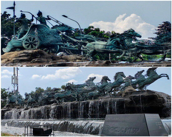 Istana Garuda or Garuda Palace in Indonesia’s new planned capital Nusantara (photo from https://www.freemalaysiatoday.com/category/world/2024/06/05/indonesia-replaces-new-capital-chief-weeks-before-opening/) (accessed on 20 June 2025) and Patung Garuda Wisnu Kencana (photo from https://commons.wikimedia.org/wiki/File:Patung_Garuda_Wisnu_Kencana_pada_tahun_2024.jpg) (accessed on 20 June 2025).