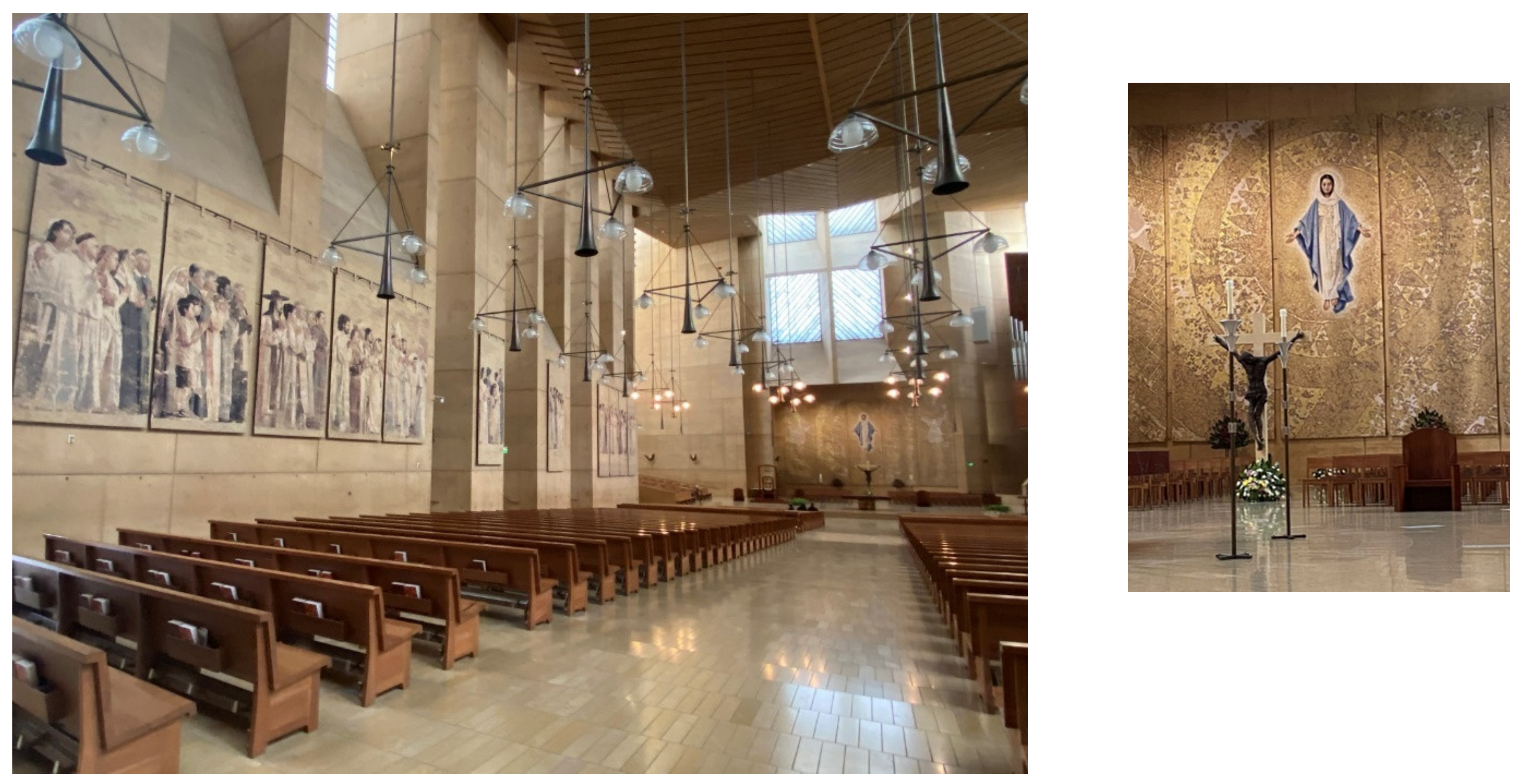There, the Stations of the cross are almost hidden, placed along the back wall and around the corner in a side corridor. The tapestry of Mary as a benevolent figure dominates over the crucifixion at the front of the cathedral while the tapestry on the side walls has the saints gazing in adoration at the figure of the virgin mother. Here it is the sense of maternal love and family that provides the dominant atmosphere for the congregation (