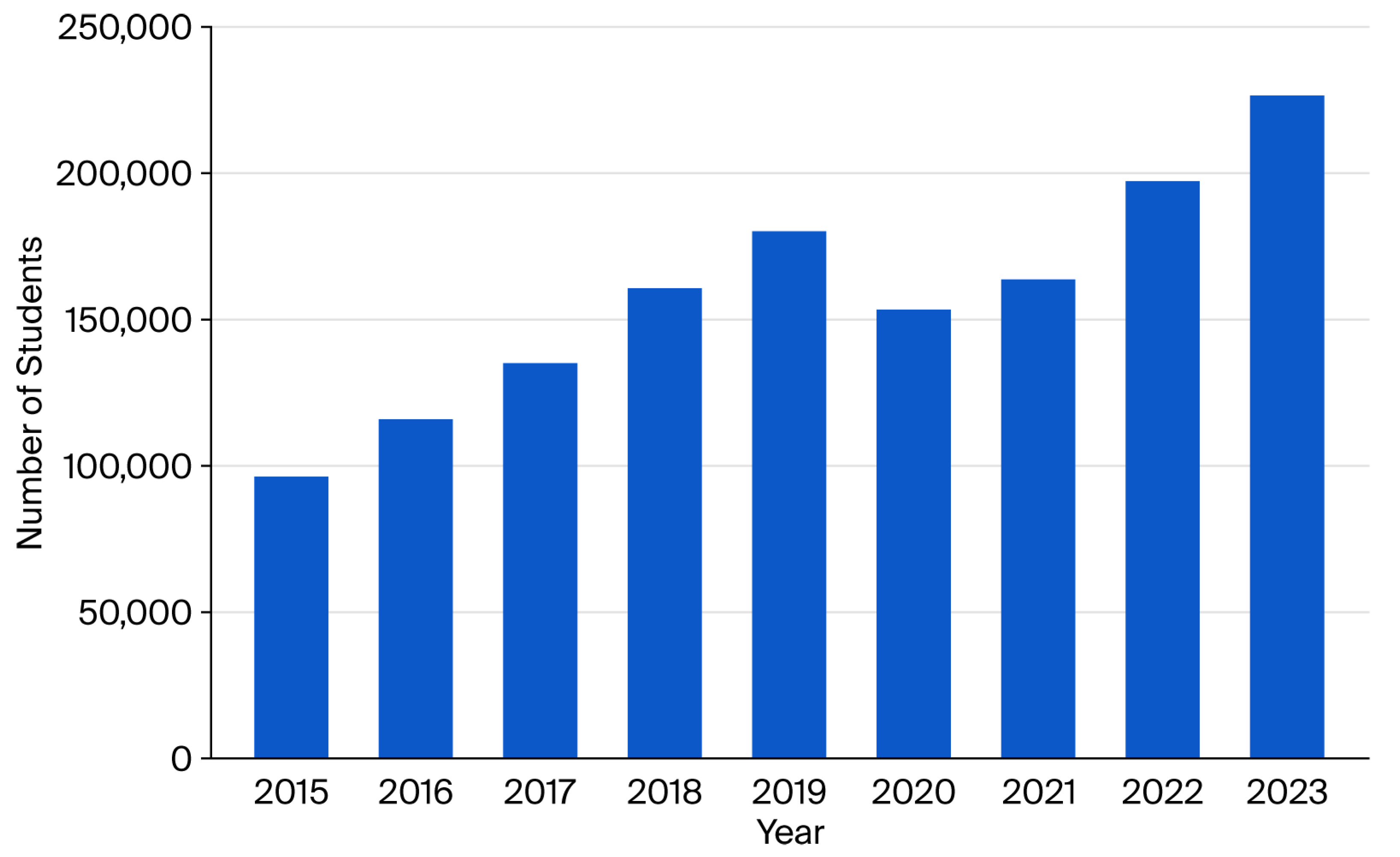 | Students | 96,357 | 115,927 | 135,087 | 160,670 | 180,131 | 153,361 | 163,697 | 197,234 | 226,507 |