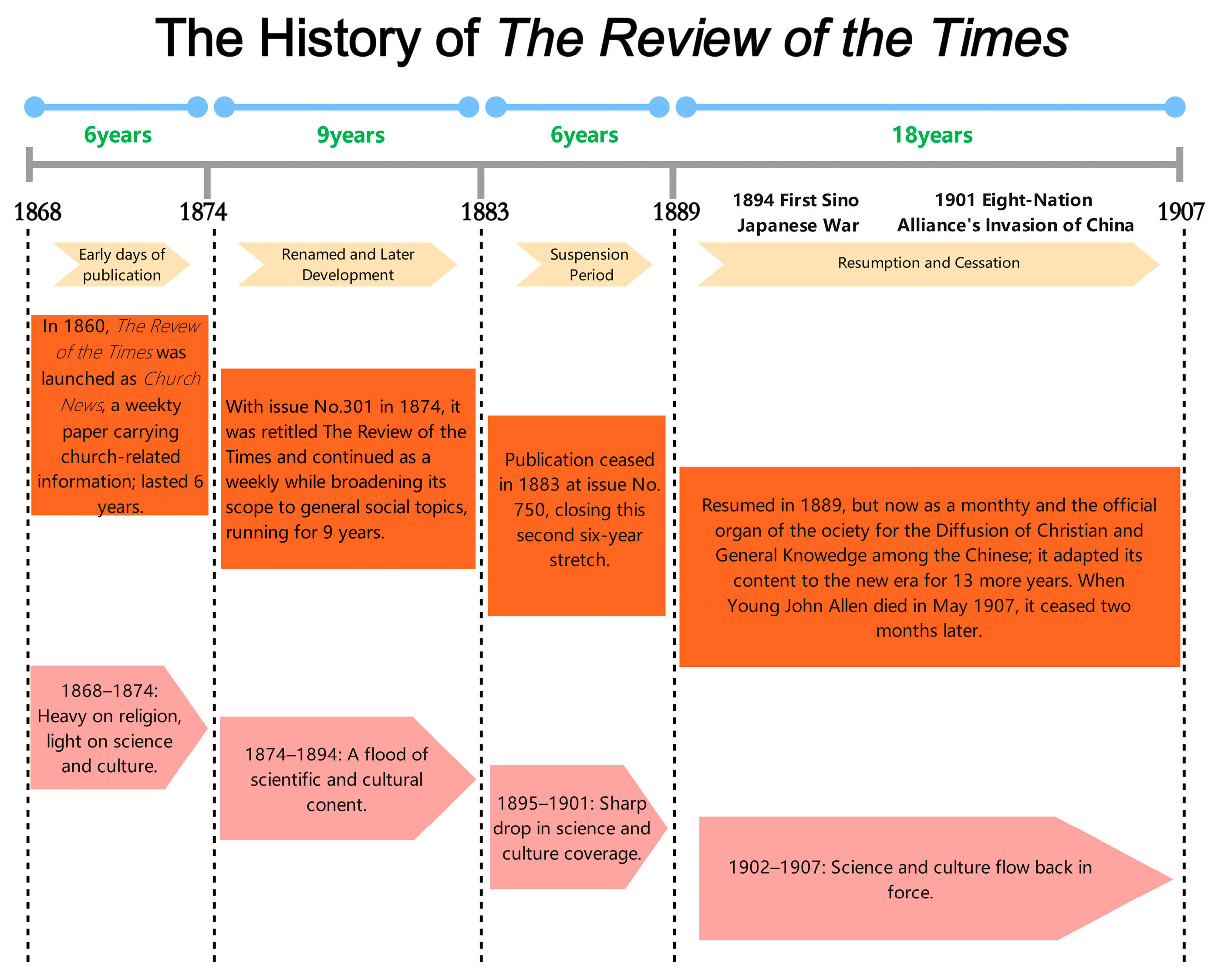 | 2 | The Review of the Times was originally named The Church News, founded in Shanghai in September 1868, with American missionary Young John Allen as editor-in-chief. Its initial founding mission was “spreading the gospel” and “connecting believers.” In 1874, The Church News was renamed The Global Magazine, transforming from a purely religious publication into a comprehensive periodical disseminating science, technology, and current affairs. It ceased publication in 1883. In February 1889, The Review of the Times resumed as a monthly publication. It finally ceased publication in July 1907. |