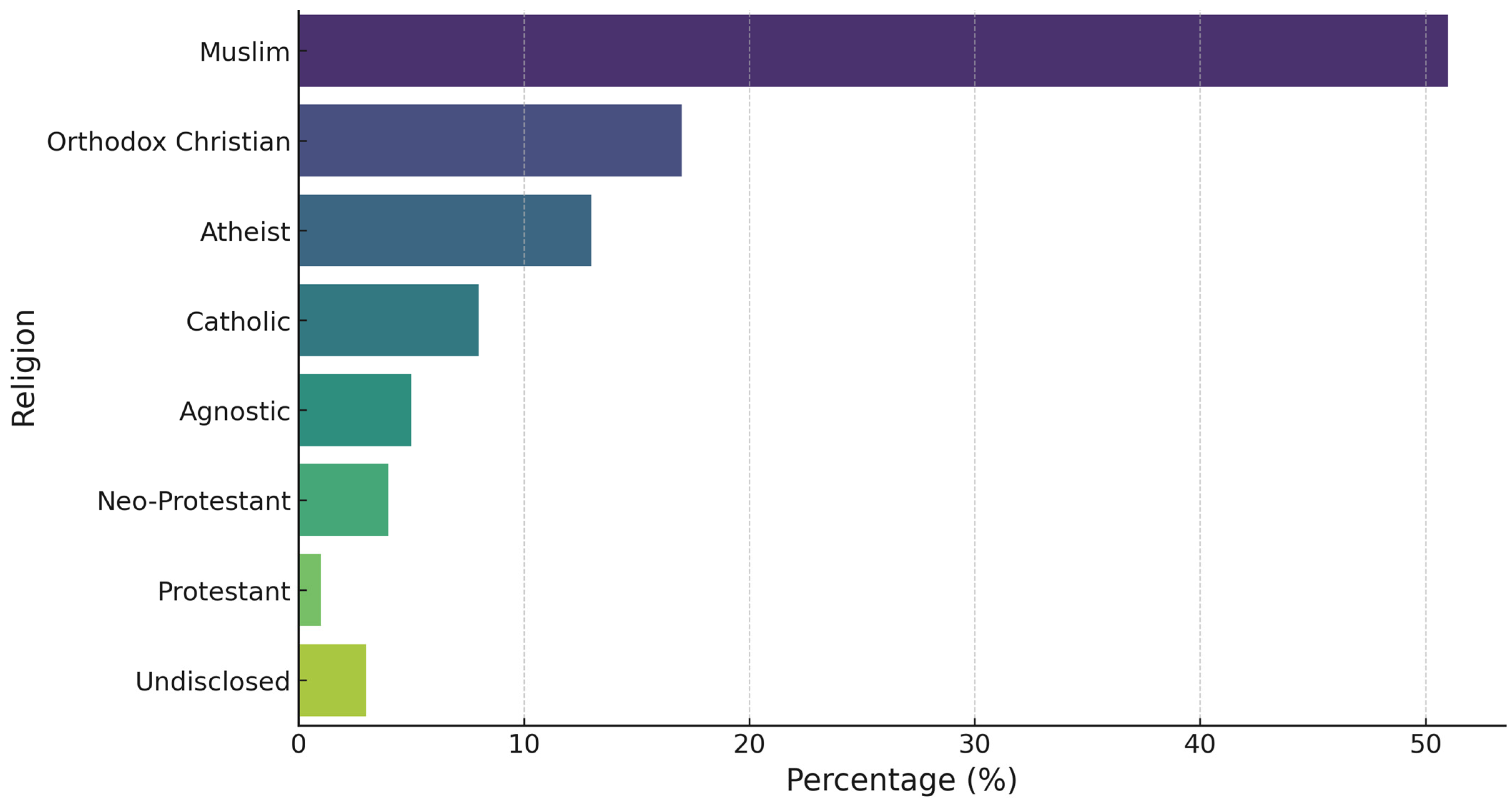 Figure 1. The largest group identified as Muslims (51%), followed by Orthodox Christians (17%), Atheists (13%), Catholics (8%) Agnosticism (5%), Neo-Protestants (4%), Protestants (1%), and chose to not disclose their religion (3%). This variety allowed for a comparative analysis of how different religious identities relate to mental health perception and coping mechanisms.