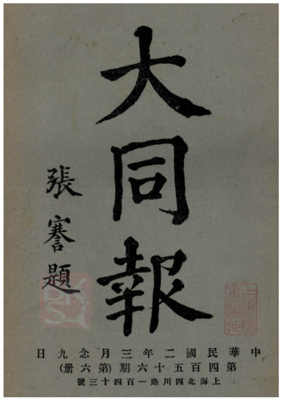 Newspapers, as a unique arena of knowledge dissemination in modern China, played an irreplaceable role in enlightening the people and guiding public opinion. Timothy Richard (李提摩太), the second general secretary of the Christian Literature Society for China (the C.L.S.C.), once observed that by controlling the discourse of China’s newspaper publishing, one could “control the head and backbone of the nation” (Fang 1981, p. 19). The Chinese Weekly 《大同报》, launched in the early twentieth century by the Society as a successor to A Review of the Times 《万国公报》, was a comprehensive periodical used to promote ideas of social reform among China’s elite. As one scholar noted in reference to The Chinese Progress 《时务报》1, “unlike the earlier missionary periodicals, The Chinese Progress pioneered the precedent of institutionalized reading, having won the strong support of numerous provincial governors and high officials” (Jiang 2019). Here, “institutionalized reading” refers to a socially systematic and organized reading practice ledby official authorities, aimed at disseminating new knowledge and promoting social transformation. In this regard, The Chinese Weekly went even further. Although initiated by missionaries, it developed a mutually beneficial network through the official consignment syste—a mechanismwhereby officials assisted newspaper publishers in selling papers—which enabled the paper to circulate widely among the officialdom of the late Qing and early Republican eras.