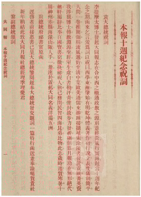 In 1914, on the occasion of the tenth anniversary of The Chinese Weekly, Donald MacGillivray invited prominent Chinese statesmen to contribute congratulatory inscriptions, to which many responded enthusiastically. Yuan Shikai, then Provisional President of the Republic, praised The Chinese Weekly as “a precious book among a hundred nations” that should be “widely circulated, with a copy in every hand” (Yuan 1914, p. 1). Figure 5 presents the special commemorative section published in 1914 to mark the tenth anniversary of The Chinese Weekly, featuring congratulatory messages from leading Chinese officials—the first of which was written by President Yuan Shikai himself.