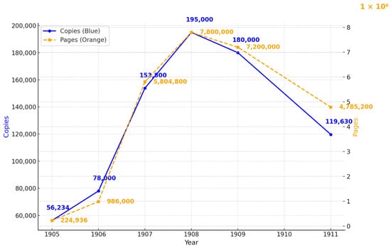 Drawing on the annual reports of the C.L.S.C., Figure 6 illustrates the circulation growth of The Chinese Weekly between 1905 and 1911. The blue line represents the number of copies distributed, while the orange dashed line indicates the total number of pages printed. The data reveal a notable surge in circulation during 1907–1908, reflecting the success of the newspaper’s expansion through official consignment and multi-channel distribution. As shown in the table above, The Chinese Weekly experienced a sharp rise in circulation after 1907, when it began publishing official portraits and implemented the official consignment system. However, by 1911, the outbreak of the Xinhai Revolution severed the newspaper’s connection to the Qing government’s patronage and financial support, resulting in a significant decline in sales. In 1913, under Donald MacGillivray’s direction of the C.L.S.C. News Bureau, The Chinese Weekly once again attracted public attention through the dual strategies of the reprint-for-gift policy and elite networking fostered by commemorative celebrations. Nevertheless, after the paper was reorganized as a monthly edition, its circulation stabilized at approximately 8500 copies—far below the prosperity of its earlier years.