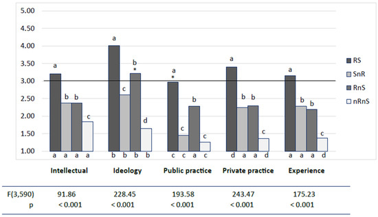 Then, we conducted a series of one-way ANOVAs and post hoc comparisons using the Bonferroni correction to examine mean differences across the four groups for each construct or dimension. ANOVA results are reported in Figure 1, Figure 2, Figure 3 and Figure 4; results of the post hoc comparisons are indicated by letters placed above the histogram bars (different letters indicate different means, with p < 0.05).