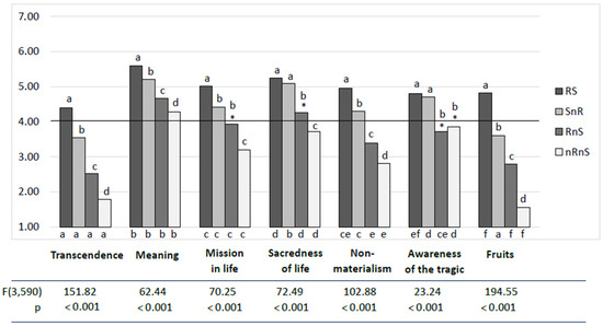 Four motives in life: Mean Scores and Comparisons. Note. RS = Religious and Spiritual; SnR = Spiritual but not Religious; RnS = Religious but not Spiritual; nRnS = neither Religious nor Spiritual. For each dimension, different letters above histograms indicate different means between groups, with p < 0.05. For each group, different letters below histograms indicate different means between the dimensions, with p < 0.05. Asterisks indicate non-significant differences between mean scores and scale midpoint.