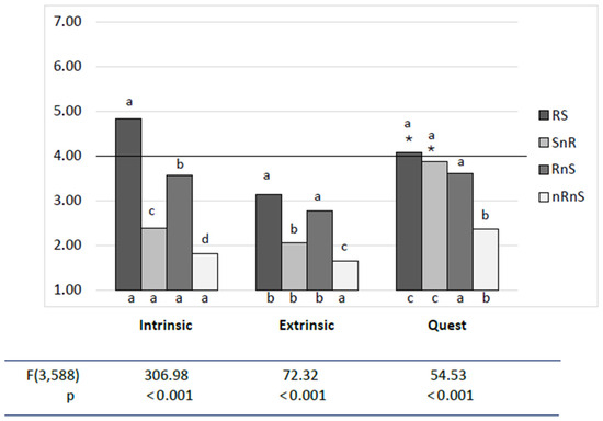 A significant variation among the four groups was observed for religious orientations, as reflected by the significant results of the ANOVAs (Figure 3). For intrinsic orientation, the highest mean score, above the scale midpoint, was found for RS, followed by progressively lower scores for RnS, SnR, and nRnS. Results for quest orientation were more homogeneous, with consistently high scores across all groups except for nRnS participants. This suggests that respondents in our sample who have a religious and/or a spiritual dimension in their life generally tend to adopt an open-ended, questioning approach to religious issues and existential questions.