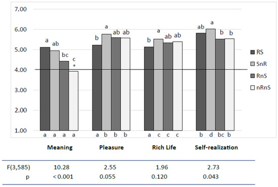 Finally, slight differences between groups were found for pleasure and rich life, which showed a similar pattern: their scores were higher for SnR than RS, with intermediate levels for RnS and nRnS.