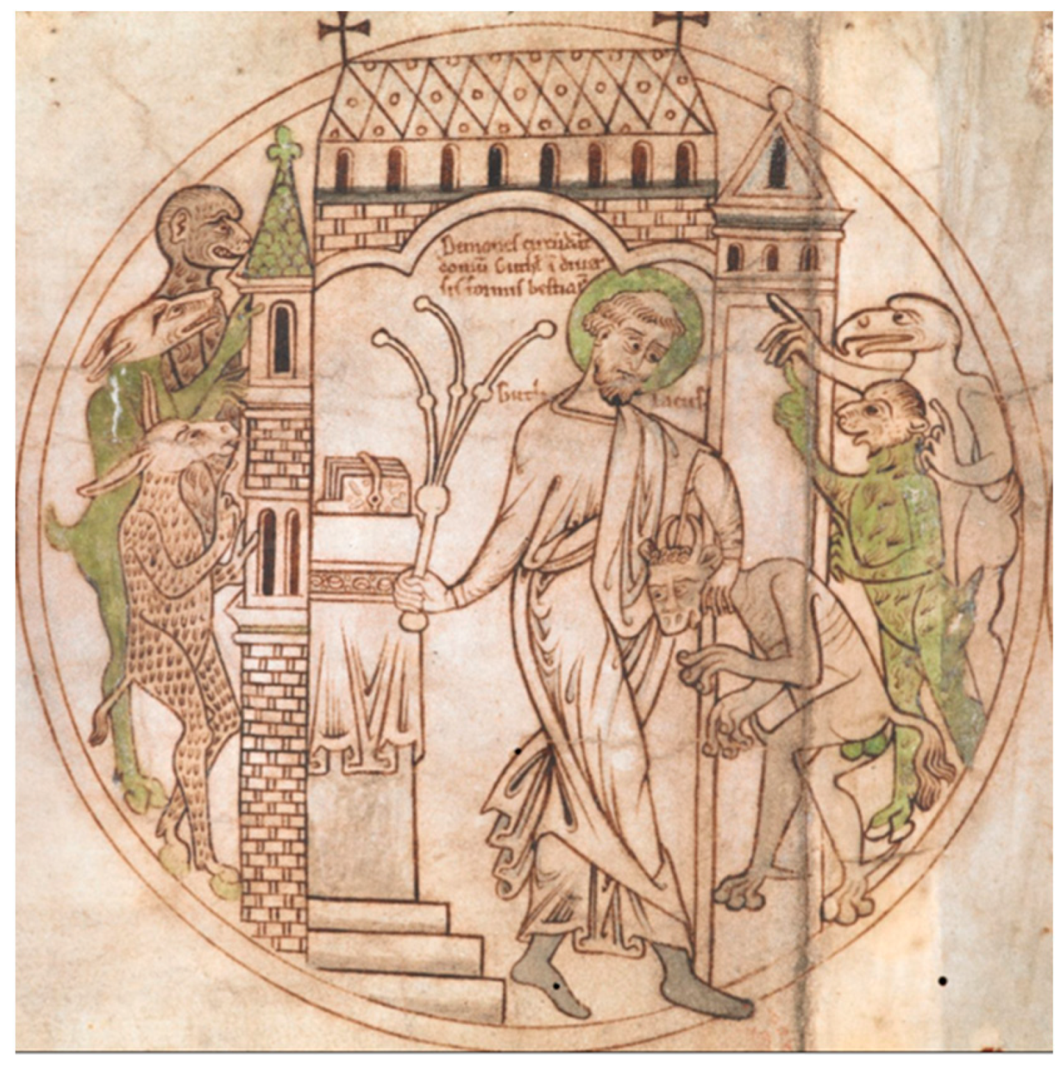 | 35 | The number of bestial demons alters from text to text. Roberts notes that the ‘roll’s six beasts, as opposed to the ten named by Felix, come closer to the revolving tally of seven deadly sins so often symbolized by animals’ (Roberts 2020, p. 253). |