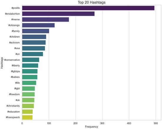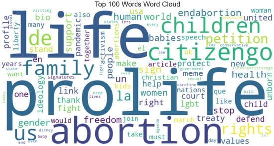 A keyword analysis of CitizenGO’s Instagram posts confirmed the centrality of pro-life activism, as well as narratives around children and family values. Figure 1 shows the 100 most-used words in the dataset. Among the top 100 words, only “Christian” refers to religion, and it ranked number 50. Figure 2 represents the 20 most-used hashtags, which mirror the dominant lexical choices illustrated in the previous two pictures. Here, the hashtag #Christianity appeared in this list, even if its use was not as prominent as the top two, #ProLife and #EndAbortion. It is worth noting that the use of #Christian does not mean that the post is about religion, as sometimes hashtags are used to suggest connections with certain words and ideas that are not explicitly mentioned.