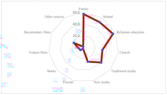 The results indicate that the main channels for transmitting that the memory of JP2’s heritage is primarily transmitted through family, school-based religious education and school itself, as well as traditional media. Less importance was attributed to new media and institutional religious communication (the Catholic Church (CC)). This shows that the figure of JP2 and his heritage are transmitted mainly through family and educational channels with an established position in the social field, and only then through religious institutions (CC) or forms of memory present in popular culture (traditional media, new media, documentaries, feature films, books). This transmission model aligns with institutionally organised post-memory, rooted within upbringing and educational structures (Kucia et al. 2013; Lowenthal 1998).
