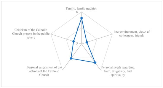 Lower ranks were given to statements concerning the institutional functions of religion, such as the significance of Catholic teaching for human life (M = 3.92; rank = 5.04), the ability of Catholicism to inspire culture (M = 3.88; rank = 4.85), the role of Catholic educational institutions (M = 3.83; rank = 4.84) and spirituality as a source of inspiration for young people (M = 3.82; rank = 4.73). The lowest rating was given to the belief that Catholicism has a future (M = 3.69; rank = 4.53), which may indicate a weakened projection of its permanence in the consciousness of the younger generation (Figure 3).