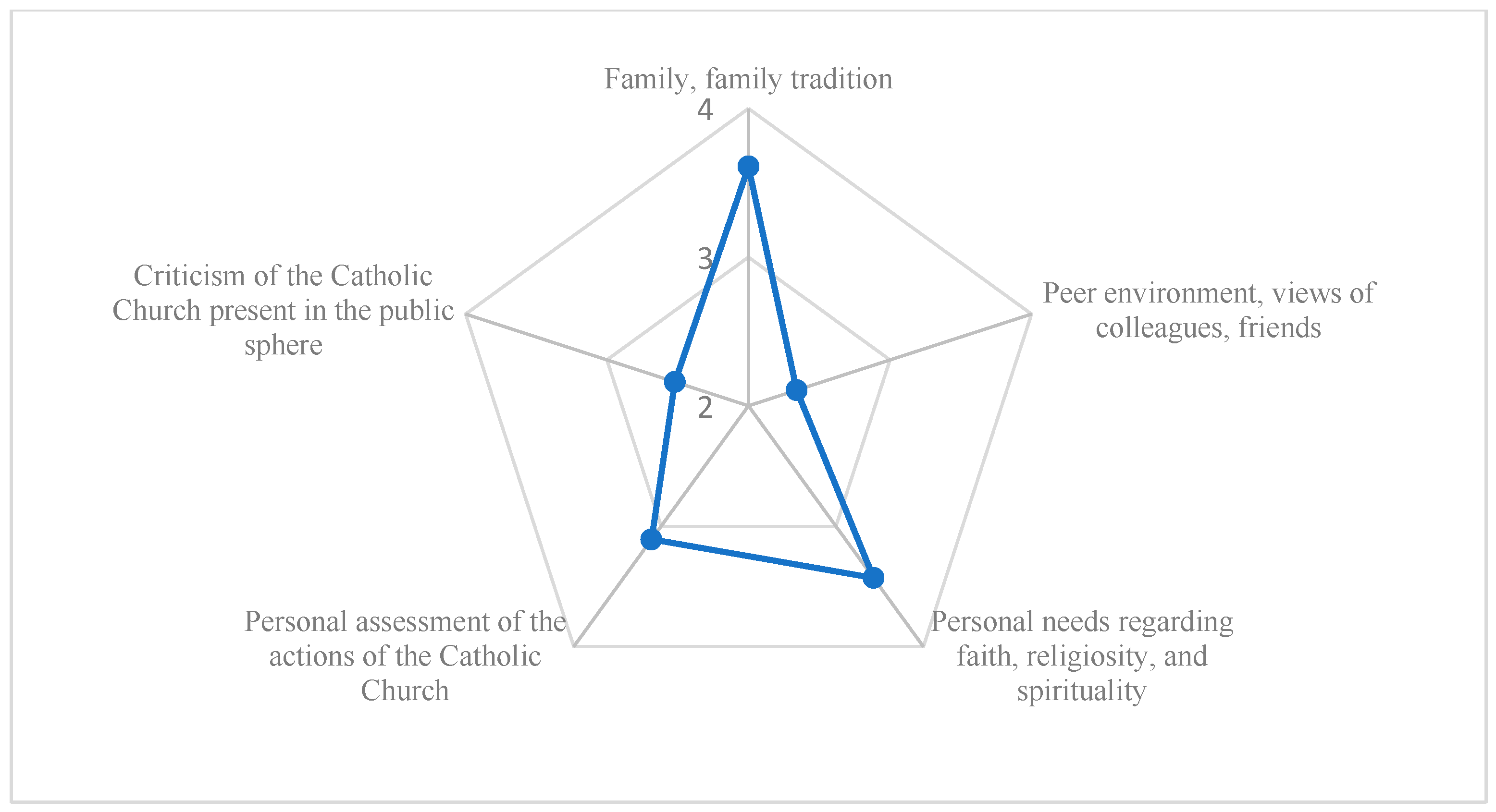 The third set includes factors respondents identified as shaping their attitudes towards religion. They constitute the socio-cultural background for the reception of JP2’s heritage, i.e., family religious tradition, peer environment (views of colleagues and friends), personal spiritual needs, personal assessment of the Catholic Church’s actions, and criticism of the Catholic Church in the public sphere. These variables served to identify the social context of the reception of JP2’s figure and teachings, which may favour or limit the internalisation of his heritage depending on the presence of religion in the social environment and public discourse.
