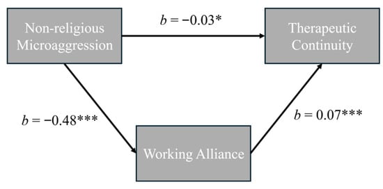 Working alliance mediating the relationship between non-religious microaggression and therapeutic continuity. Note: * p < 0.05, *** p ≤ 0.001.