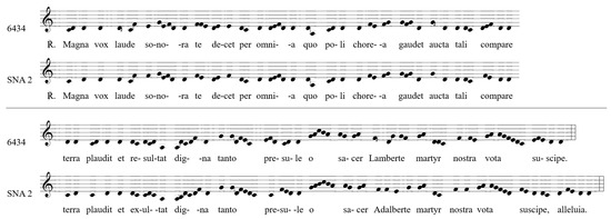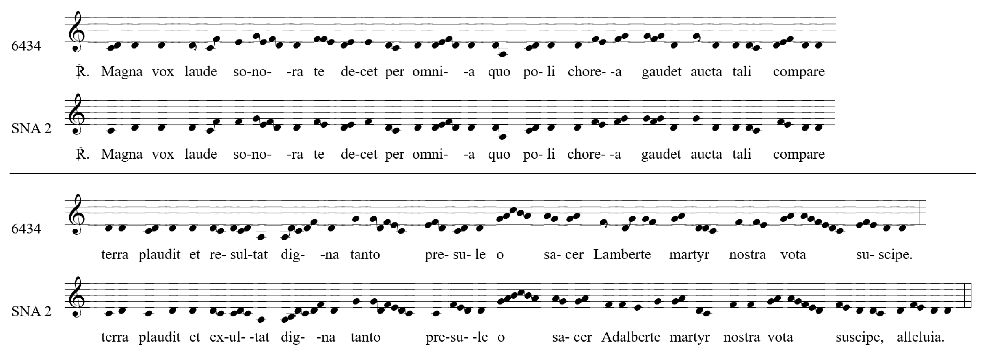 | Magna vox laude sonora te decet per omnia quo poli chorea gaudet aucta tali compare terra plaudit et resultat digna tanto presule o sacer Lamberte martyr nostra vota suscipe. | Magna vox laude sonora te decet per omnia quo poli corea gaudet aucta tali compare terra plaudit et exultet digna tanto presule o sacer Adalberte martir nostra vota suscipe, alleluia. |