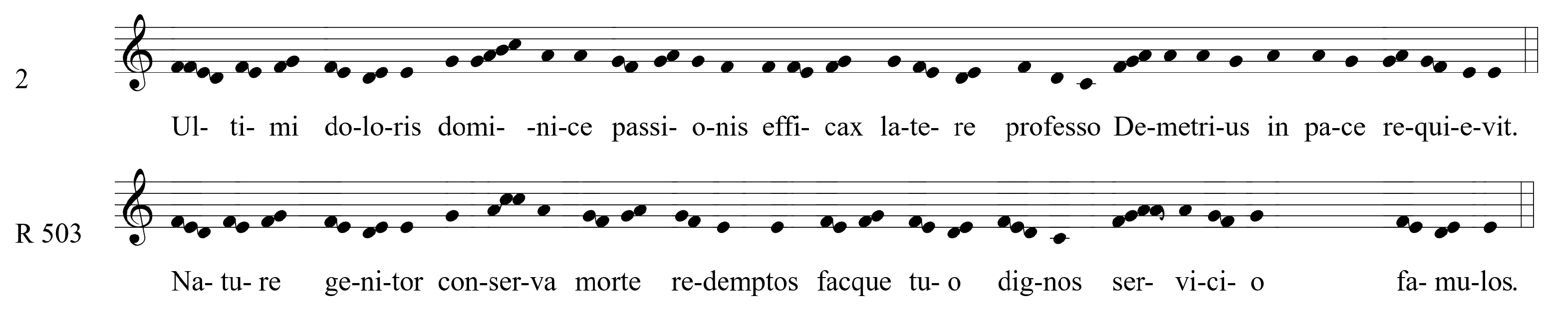 | MR2.1 | Nestor iam renatus v/Per nomen sancti Demetrii | Contrafact | Audi Israel precepta v/Observa igitur et audi |