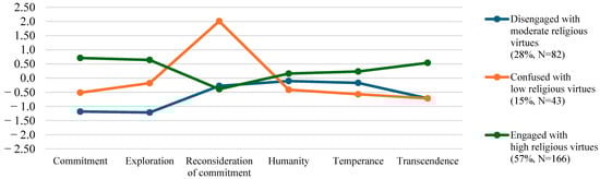 Individuals in the Confused with low religious virtues profile are characterized by low levels of commitment, low to moderate levels of exploration, and high levels of reconsideration of commitments, together with reduced levels of Transcendence, Humanity, and Temperance, compared to the other groups. These individuals reported the lowest levels of life satisfaction and positive affect, together with the highest levels of negative affect.
